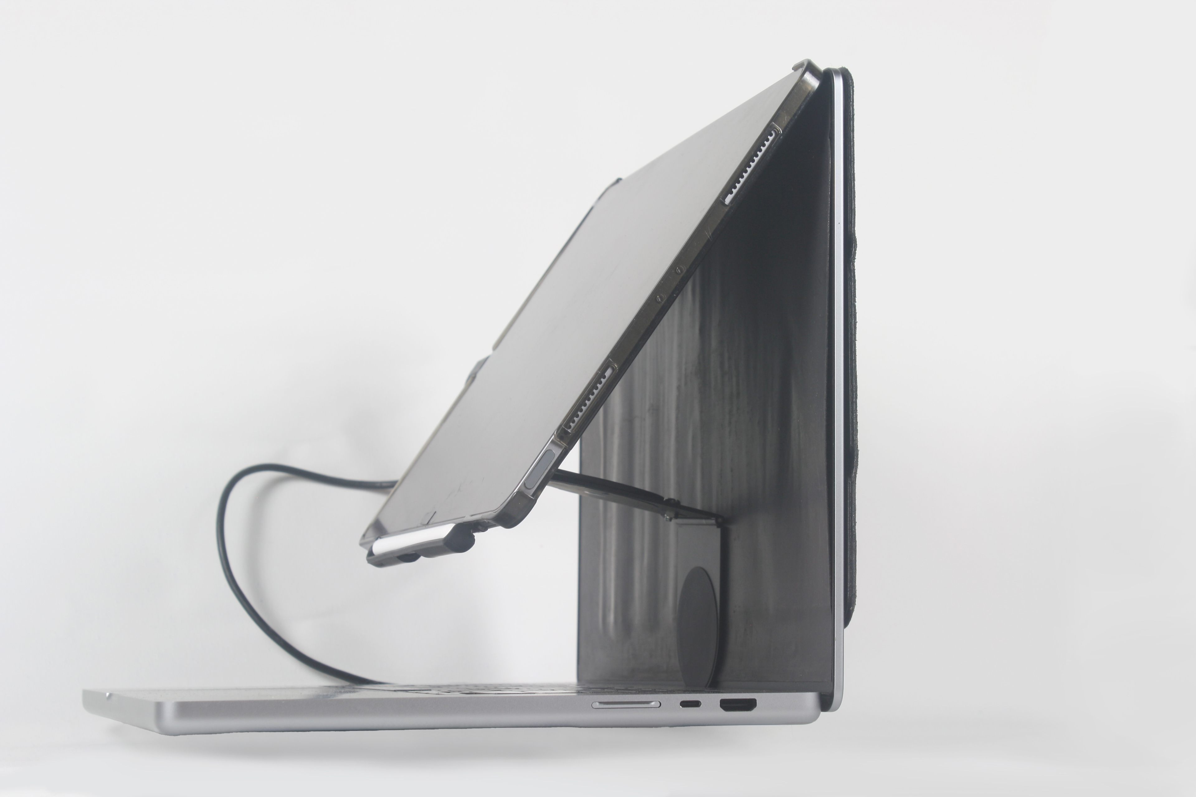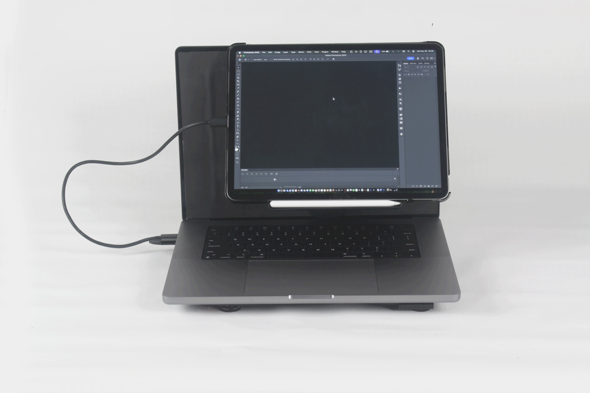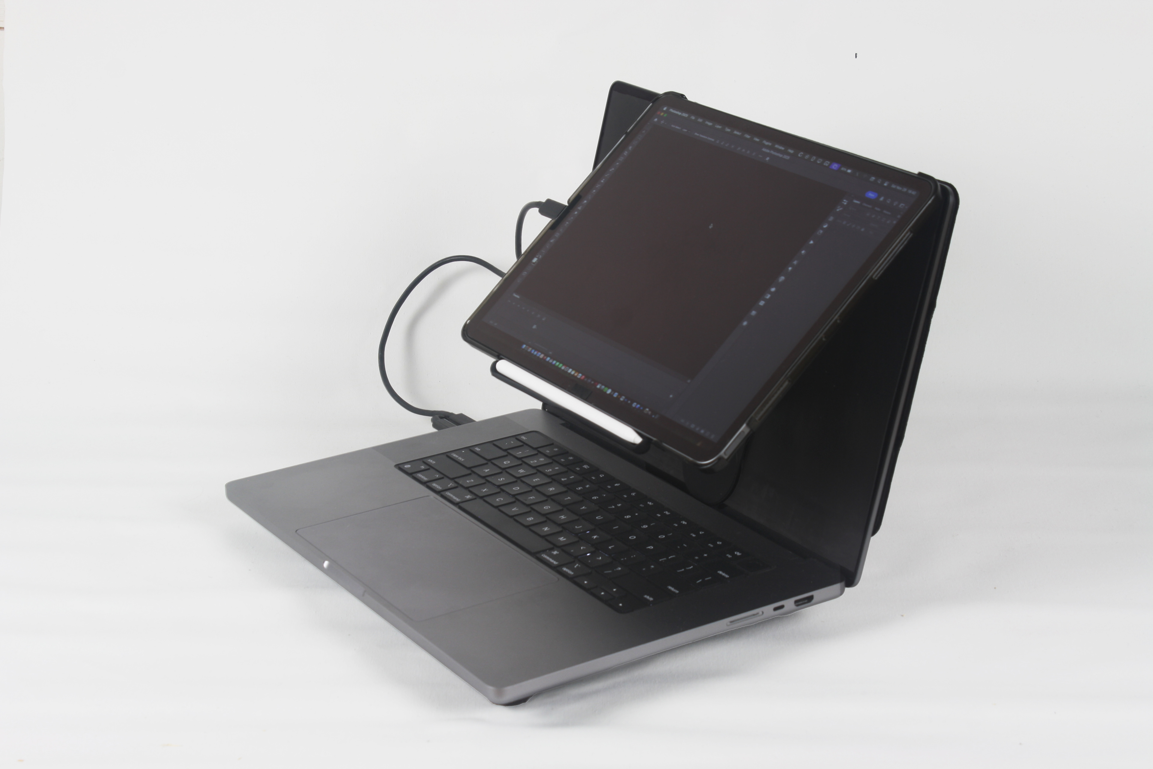 Here’s a simple way to salvage a laptop whose screen is broken: simply attach a tablet mounted in a folio case. Stick the folio flap to the back of the laptop’s screen using strong double-sided tape. Use the “screen sharing” / “display mirroring” mode available in your operating system. Optional: Use two magnetic stands together to create an angle for the tablet. This gives it an ergonomic tilt and brings the surface closer for easier drawing or simply stick a piece a cardboard instead.. You can also place a square bracket on the back of the laptop to stabilize the screen and prevent the drawing surface from wobbling.