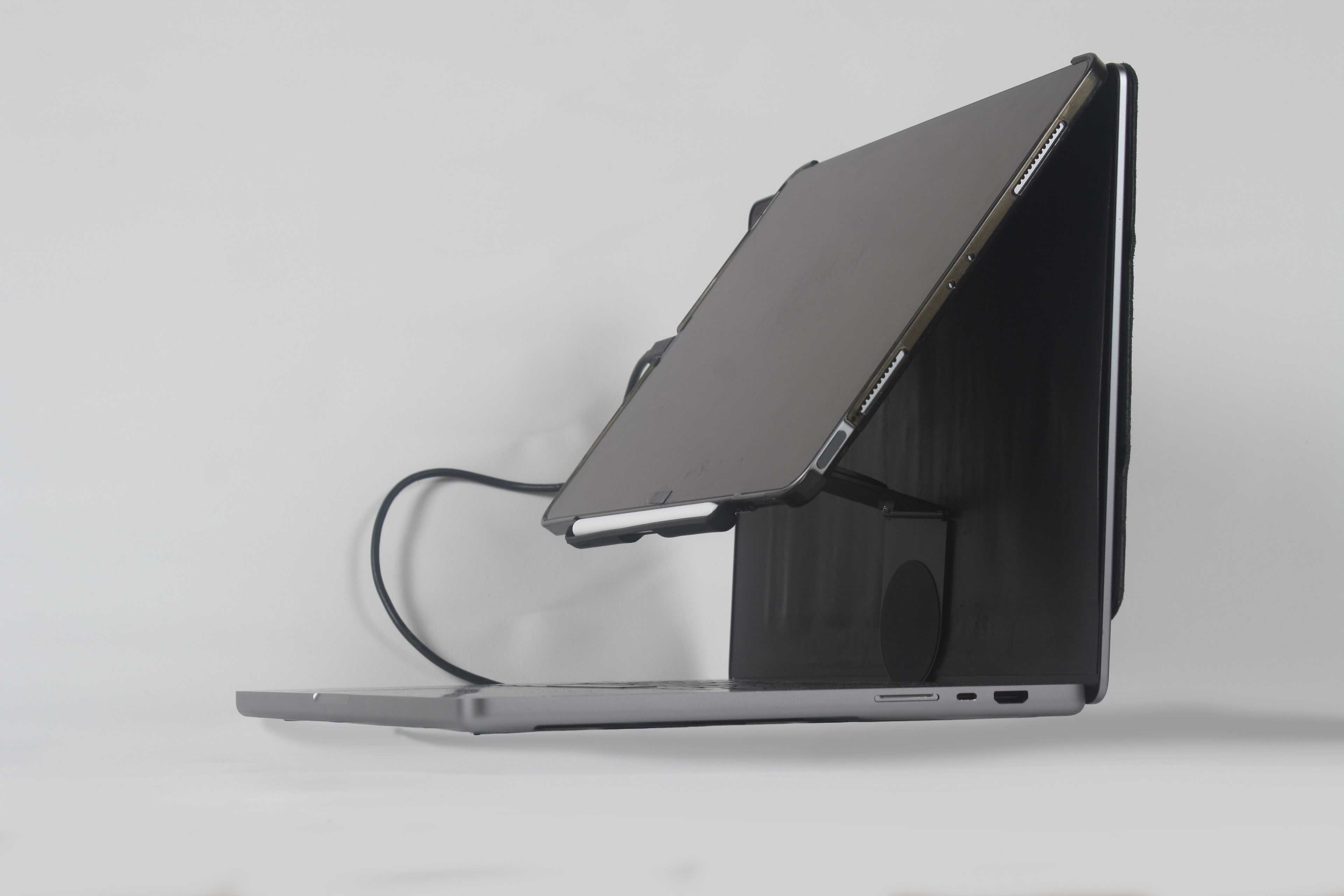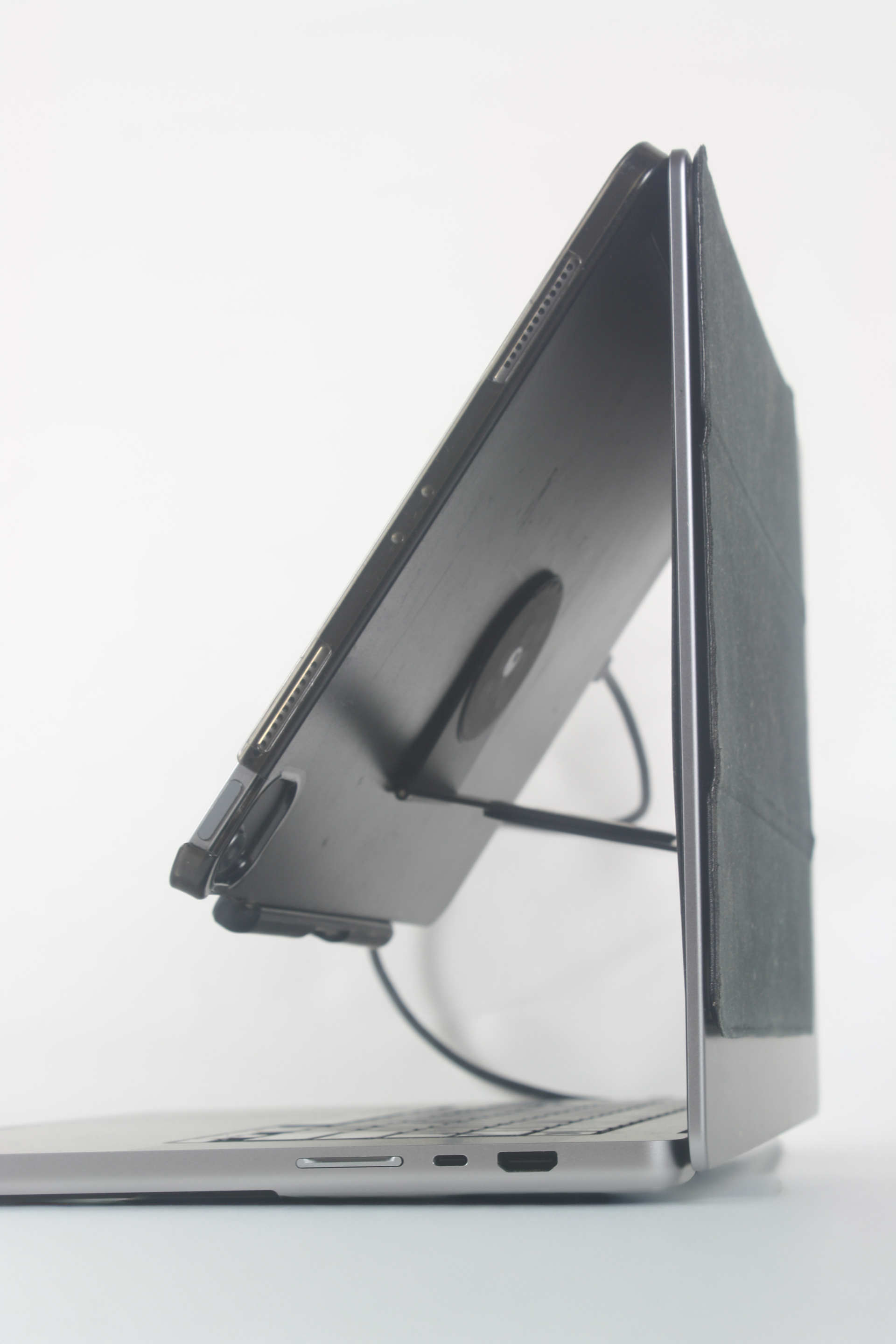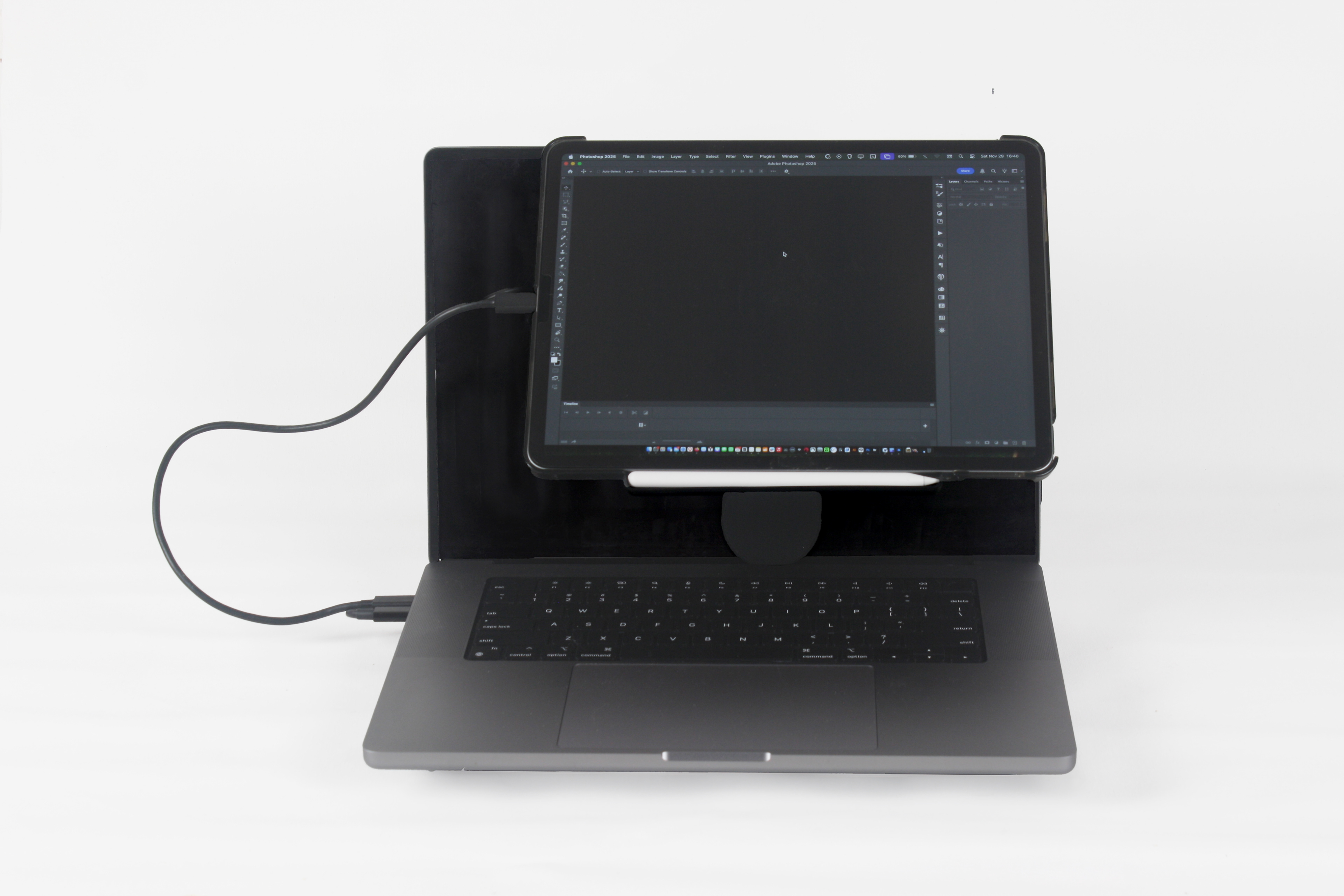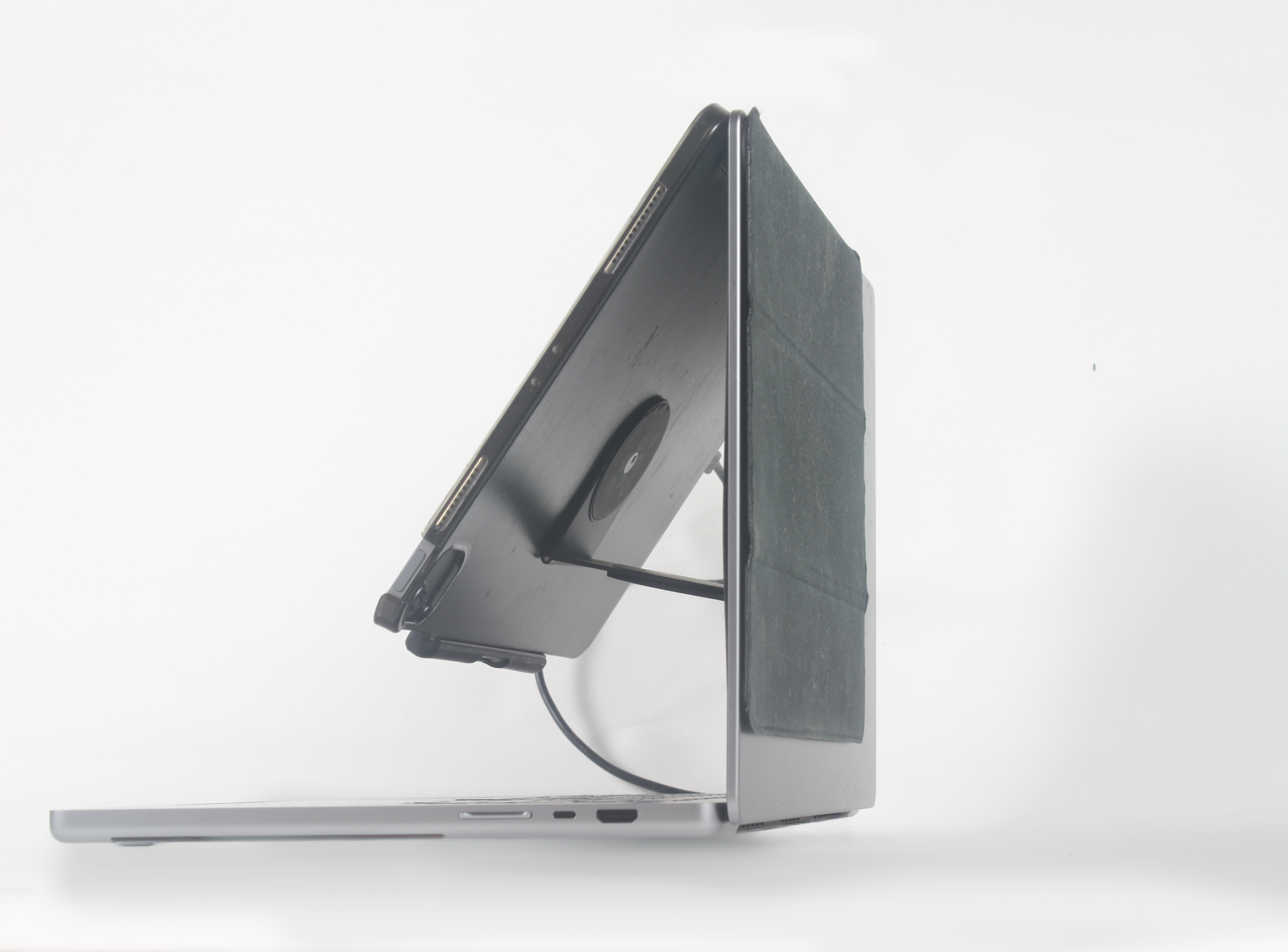 Here’s a simple way to salvage a laptop whose screen is broken: simply attach a tablet mounted in a folio case. Stick the folio flap to the back of the laptop’s screen using strong double-sided tape. Use the “screen sharing” / “display mirroring” mode available in your operating system. Optional: Use two magnetic stands together to create an angle for the tablet. This gives it an ergonomic tilt and brings the surface closer for easier drawing or simply stick a piece a cardboard instead.. You can also place a square bracket on the back of the laptop to stabilize the screen and prevent the drawing surface from wobbling.